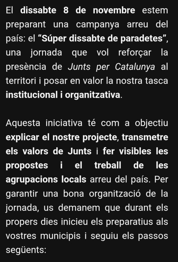 Junts parece haber tomado nota y, como muestra este correo que nos ha facilitado una fuente interna del partido de Puigdemont, han preparado una jornada idéntica a la que prepara la derecha catalana: