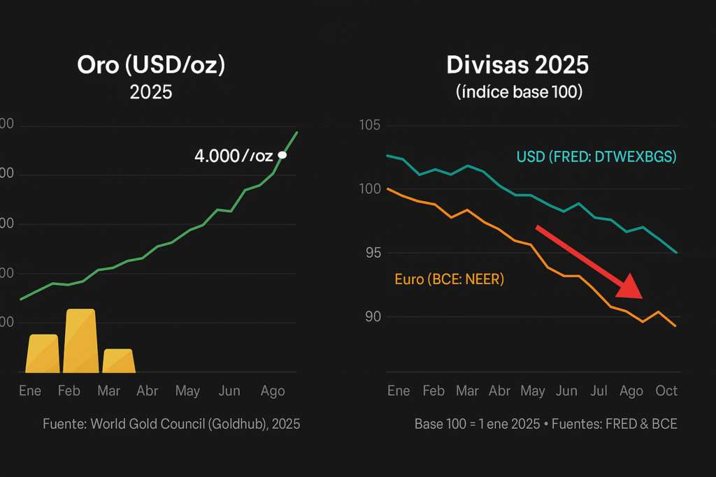 El dato cierto es que el oro rebasó los 4.000 $/oz el 8 de octubre y que los índices europeos han marcado picos en octubre; lo que está en discusión es cuánto de ese avance obedece a valor intrínseco y cuánto a la merma del poder de compra de las monedas. El seguimiento de WGC, FRED y BCE será determinante para discriminar ambas dimensiones en lo que resta de 2025.