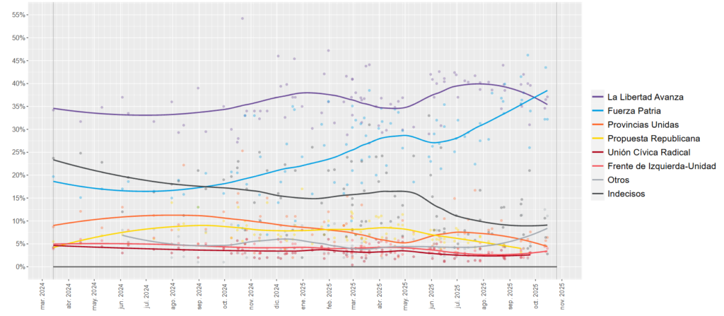 Los promedios y mediciones conocidas en octubre apuntan a un escenario abierto. Distintos sondeos nacionales situaron a La Libertad Avanza (LLA) entre 34,6% y 37,1% y a la principal coalición opositora (Fuerza Patria/peronismo) entre 32,2% y 43,5%, con terceros espacios alrededor del 5–6% y bolsas de indecisos que van del 6% al 11%. En cortes recientes: CB Consultora (11–15 de octubre) estimó LLA 37,1% y peronismo 32,2% (indecisos 11,1%); Rubikon (11–12 de octubre) midió 34,6% vs. 32,2%; y Zentrix (7–13 de octubre) dio ventaja a la oposición (43,5% vs. 36,5%). La horquilla confirma una contienda competida y subraya que la participación y el voto tardío serán determinantes.