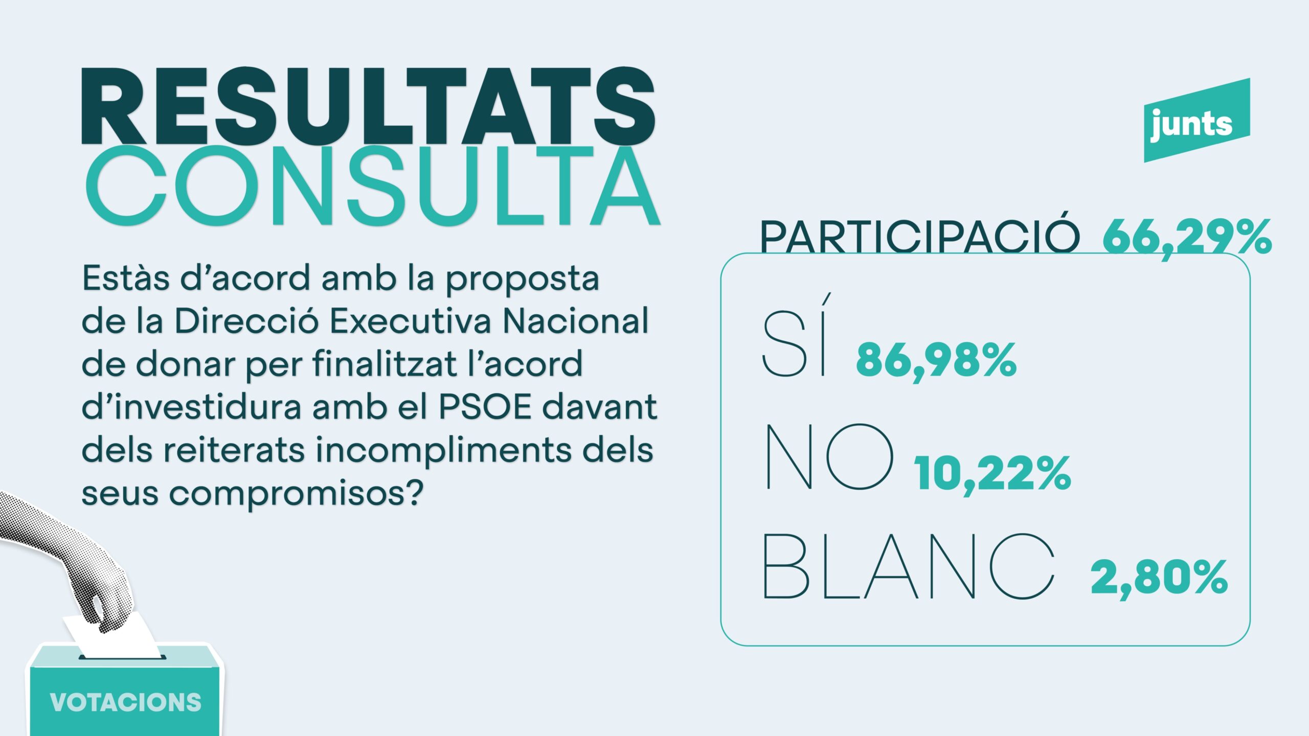 ✅ Els afiliats de Junts per Catalunya han ratificat la decisió de la direcció de posar punt final a l’acord d’investidura amb el PSOE amb un 86,98% de vots favorables.