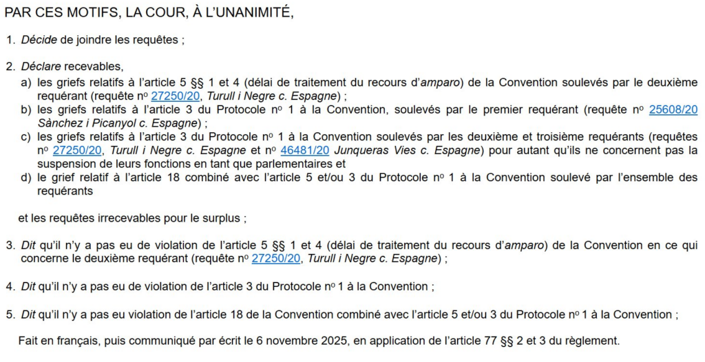 El Tribunal Europeo de Derechos Humanos (TEDH) dictó hoy, 6 de noviembre, una sentencia unánime que concluye que España no vulneró los derechos políticos de Oriol Junqueras, Jordi Turull y Jordi Sànchez al mantenerlos en prisión preventiva tras los hechos del 2017, por lo que avala las resoluciones adoptadas por el Tribunal Supremo y el Tribunal Constitucional en ese periodo. La resolución remarca que las decisiones nacionales no fueron arbitrarias ni ilegales y que buscaban preservar el orden constitucional.