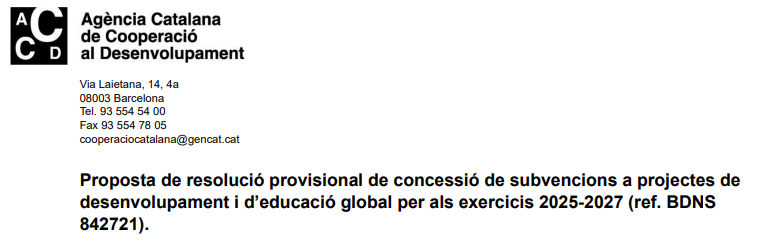 La Agència Catalana de Cooperació al Desenvolupament (ACCD) ha aprobado esta semana la propuesta de resolución provisional de las subvenciones a proyectos de cooperación internacional y educación global para el periodo 2025-2027, con una línea de ayudas que este año supera los 36,8 millones de euros, frente a una dotación inicial de 25 millones ampliada con casi 12 millones adicionales. La convocatoria, identificada con la referencia BDNS 842721, se abrió mediante la Resolución UEX/2499/2025, de 26 de junio, publicada en el Diari Oficial de la Generalitat de Catalunya a principios de julio, y se dirige a proyectos plurianuales ejecutados dentro y fuera de la Unión Europea. La propuesta provisional publicada el 25 de noviembre en el tablón electrónico incluye los anexos con las entidades y los importes propuestos de subvención.