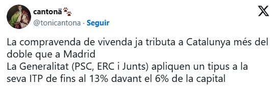 El usuario @tonicantona señala la responsabilidad compartida: «La Generalitat (PSC, ERC i Junts) apliquen un tipus a la seva ITP de fins al 13%»