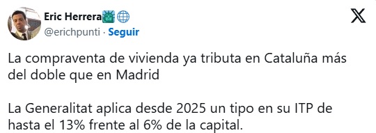 El fundador del @InstitutOstrom, @erchpunti denuncia directamente: «La Generalitat aplica desde 2025 un tipo en su ITP de hasta el 13% frente al 6% de la capital», acumulando cientos de interacciones.
