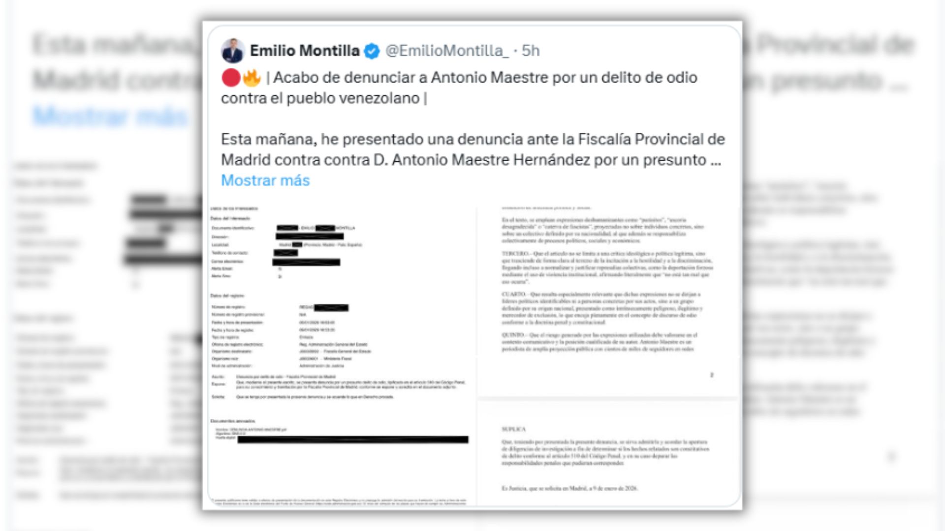 La controversia se inició con un tuit de laSexta Noticias el 7 de enero, promocionando el artículo de Antonio Maestre titulado «La gusanera fascista venezolana en España». En respuesta, el usuario Emilio Montilla presentó una denuncia ante la Fiscalía Provincial de Madrid contra el periodista, alegando incitación al odio contra la comunidad venezolana, bajo el artículo 510 del Código Penal. El anuncio de la denuncia @EmilioMontilla_ ha sumado miles de interacciones.