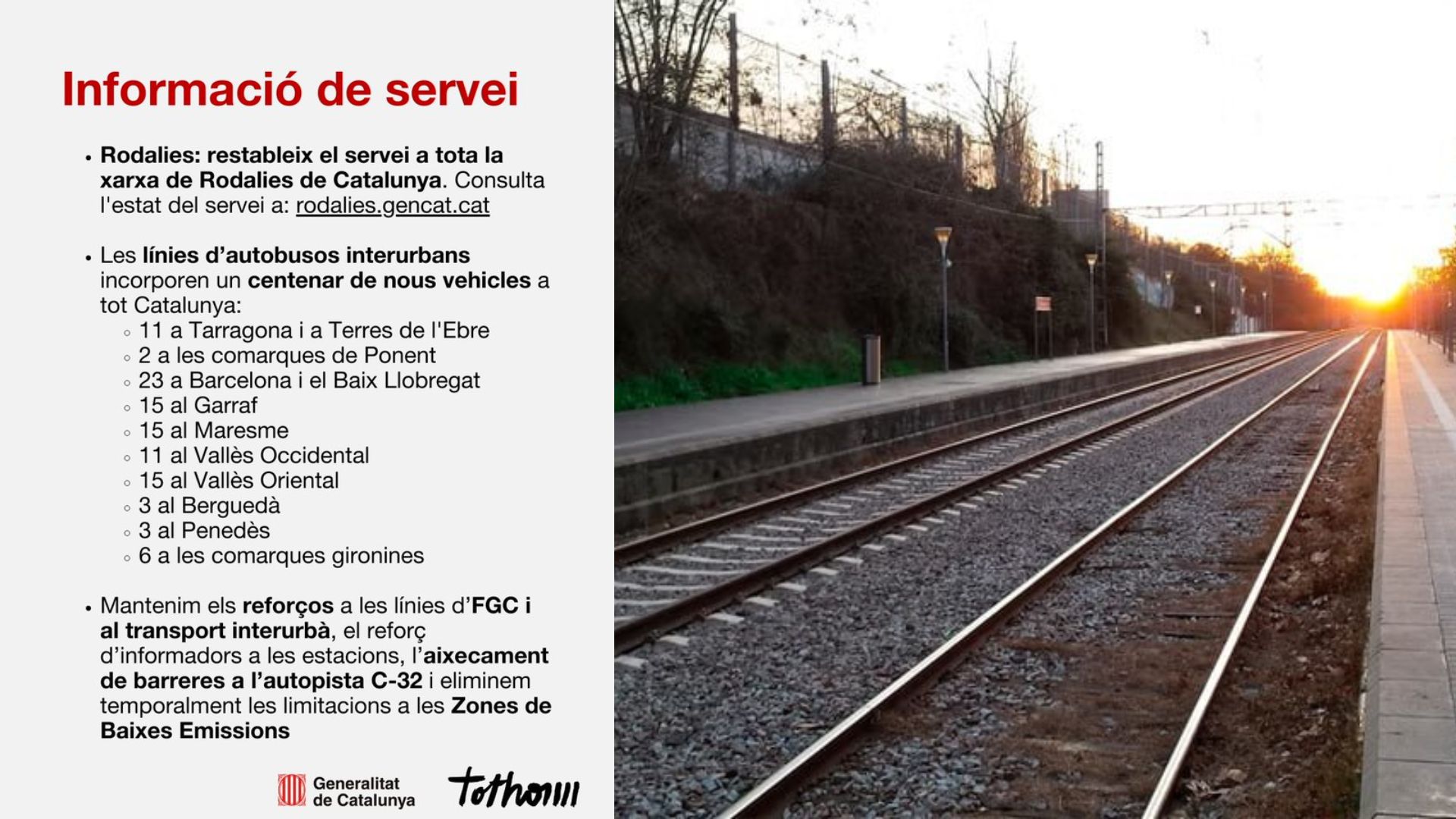 • Carreteras: La AP-7 sigue cortada en sentido sur (Martorell-Sant Sadurní d’Anoia) por evaluación de estabilidad del puente y talud. Accesos a Barcelona (C-31, C-32) con congestiones extremas por el aumento de vehículos privados. Carreteras secundarias con cortes intermitentes por desprendimientos e inundaciones.