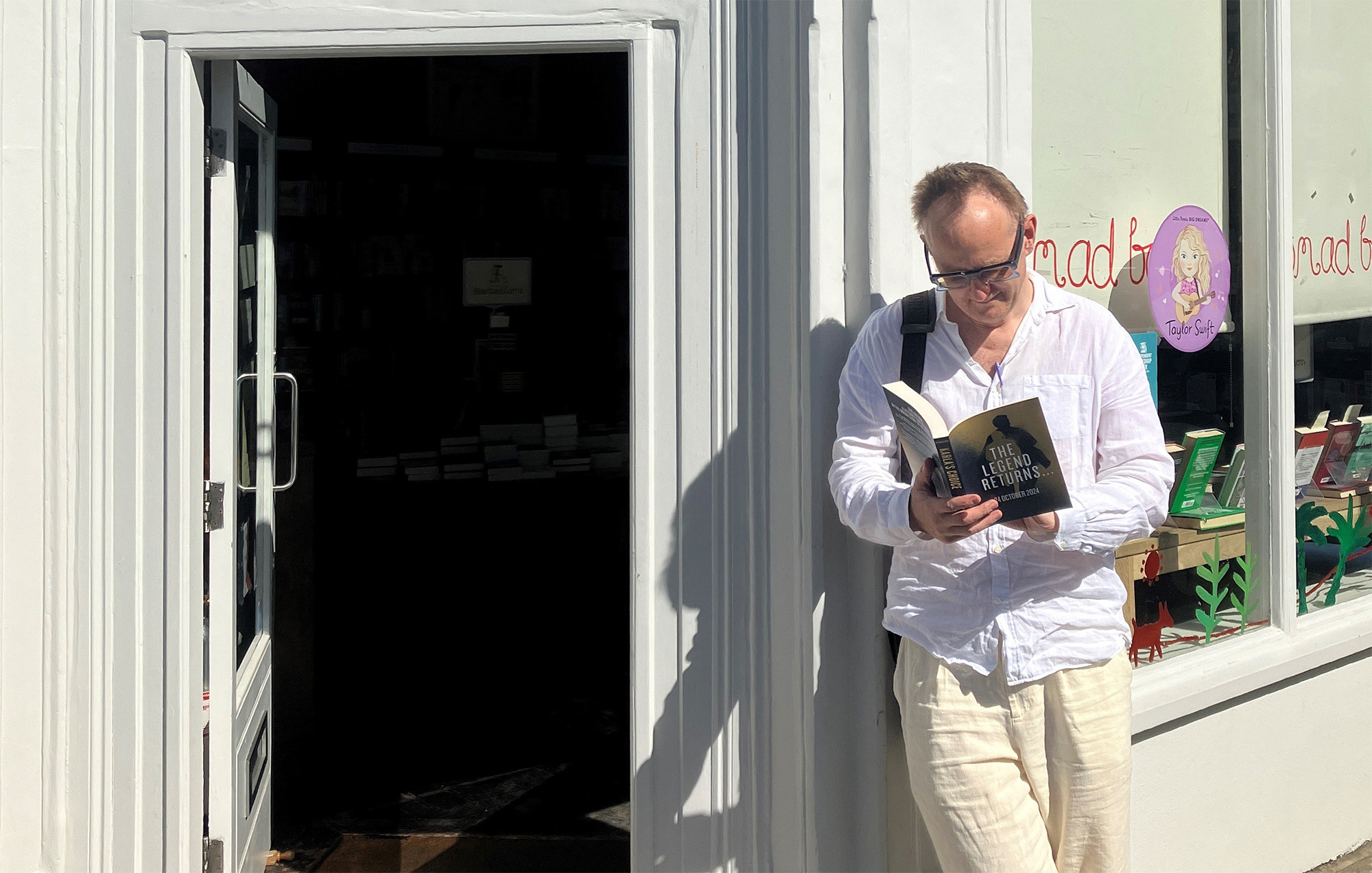 Nick Harkaway, autor de 'La decisión de Karla', posa junto a la puerta de una librería.
