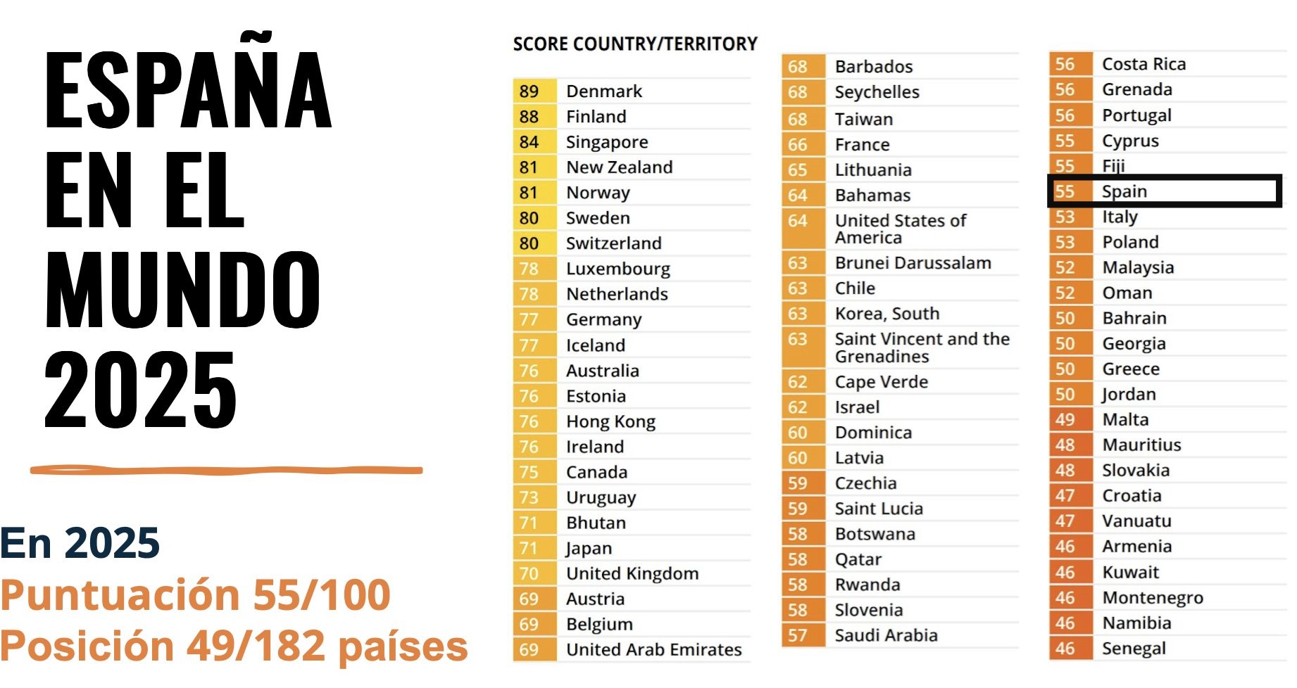España obtiene 55/100 en el Índice de Percepción de la Corrupción 2025