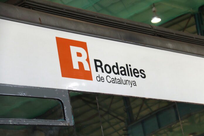 Detalle del logotipo de Rodalies de Catalunya en la parte superior de un vagón de tren de Renfe.
